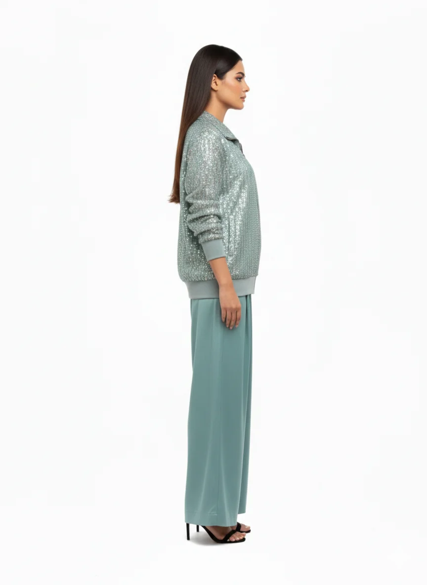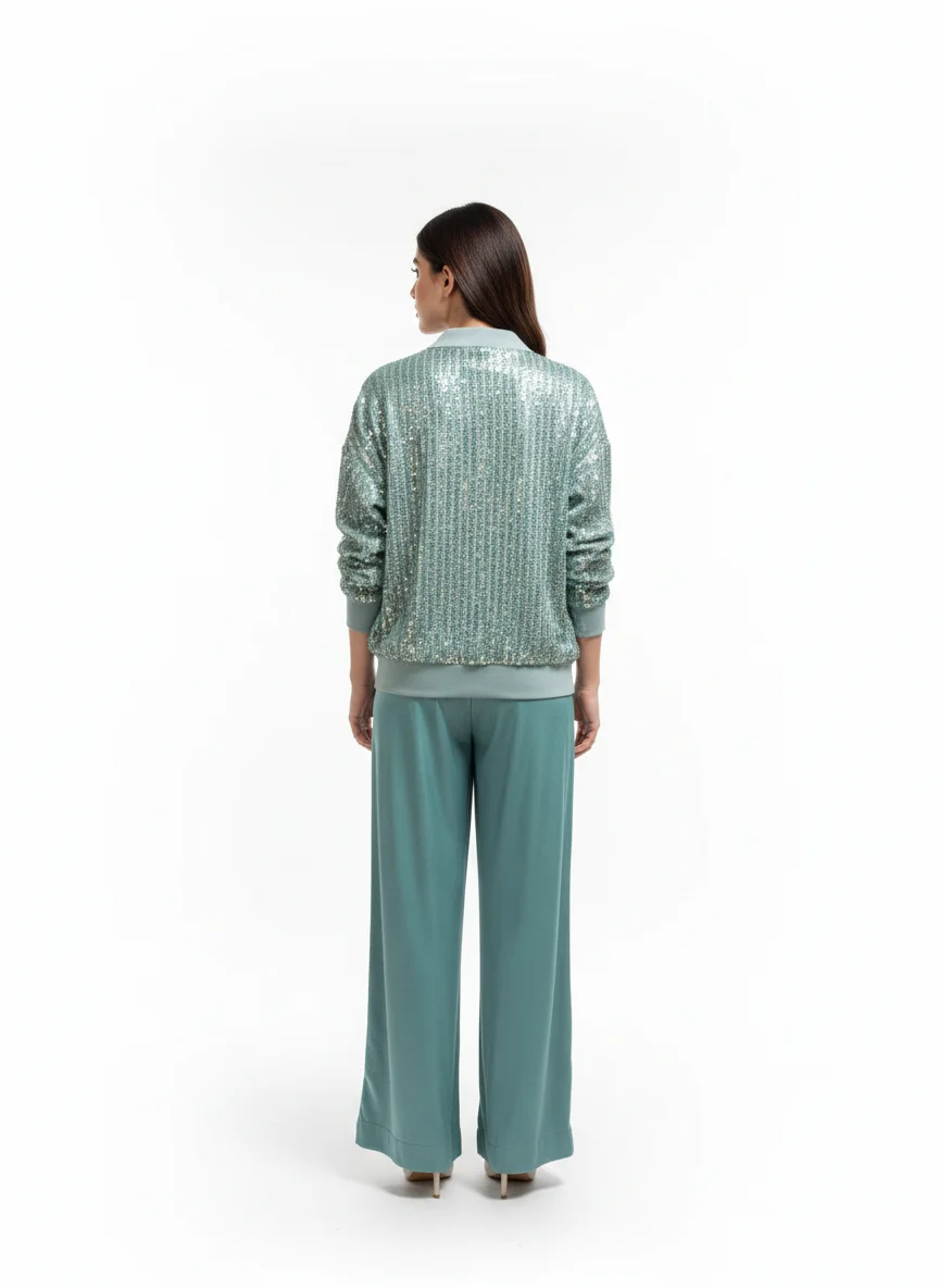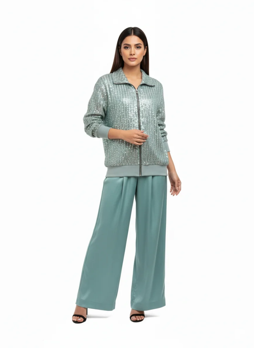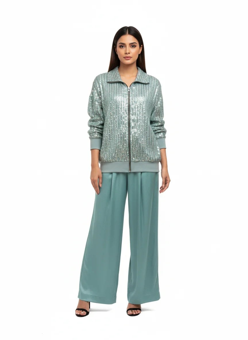 Make a splash with the “Aqua Sequence Jacket Set,” a high-energy ensemble that perfectly balances shimmer with sport. The jacket is drenched in light-catching sequins for a multi-dimensional glow, while the sweeping wide-leg trousers provide a sophisticated, grounded silhouette. Ideal for parties or premium events where you want to combine bold color with an effortless, modern fit.