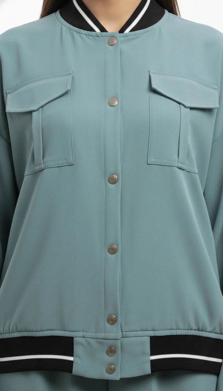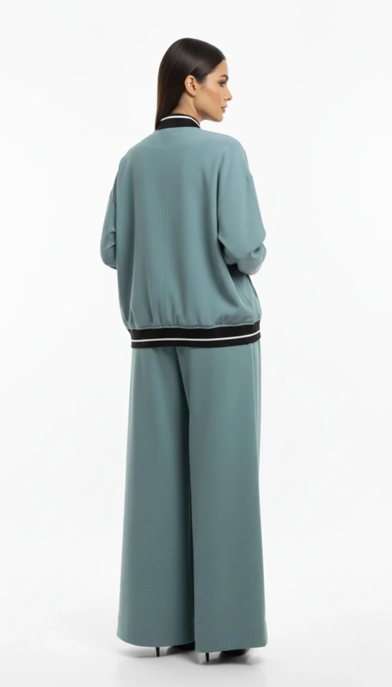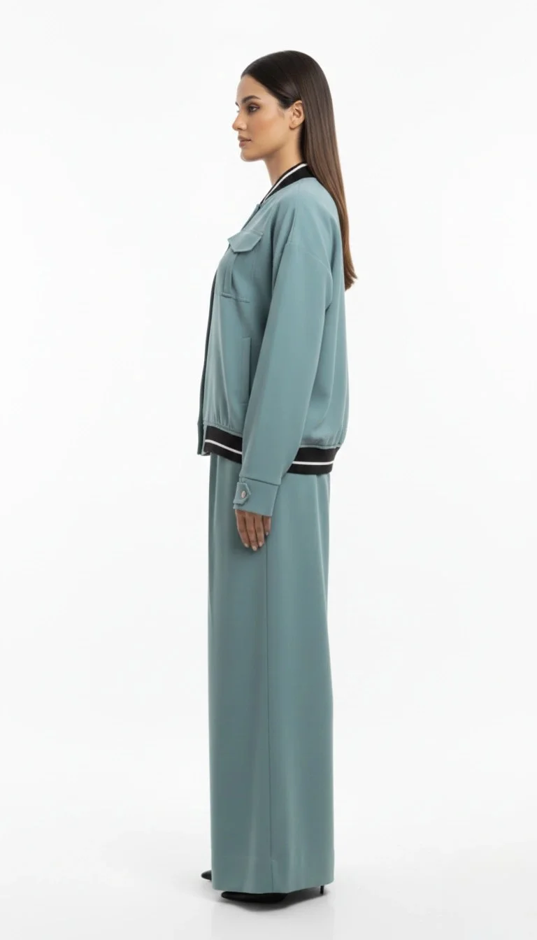 A sophisticated fusion of athletic structure and contemporary elegance. This co-ord set features a utility-inspired bomber top paired with sweeping wide-leg trousers, creating a versatile ensemble that transitions effortlessly from professional settings to elevated casual outings.